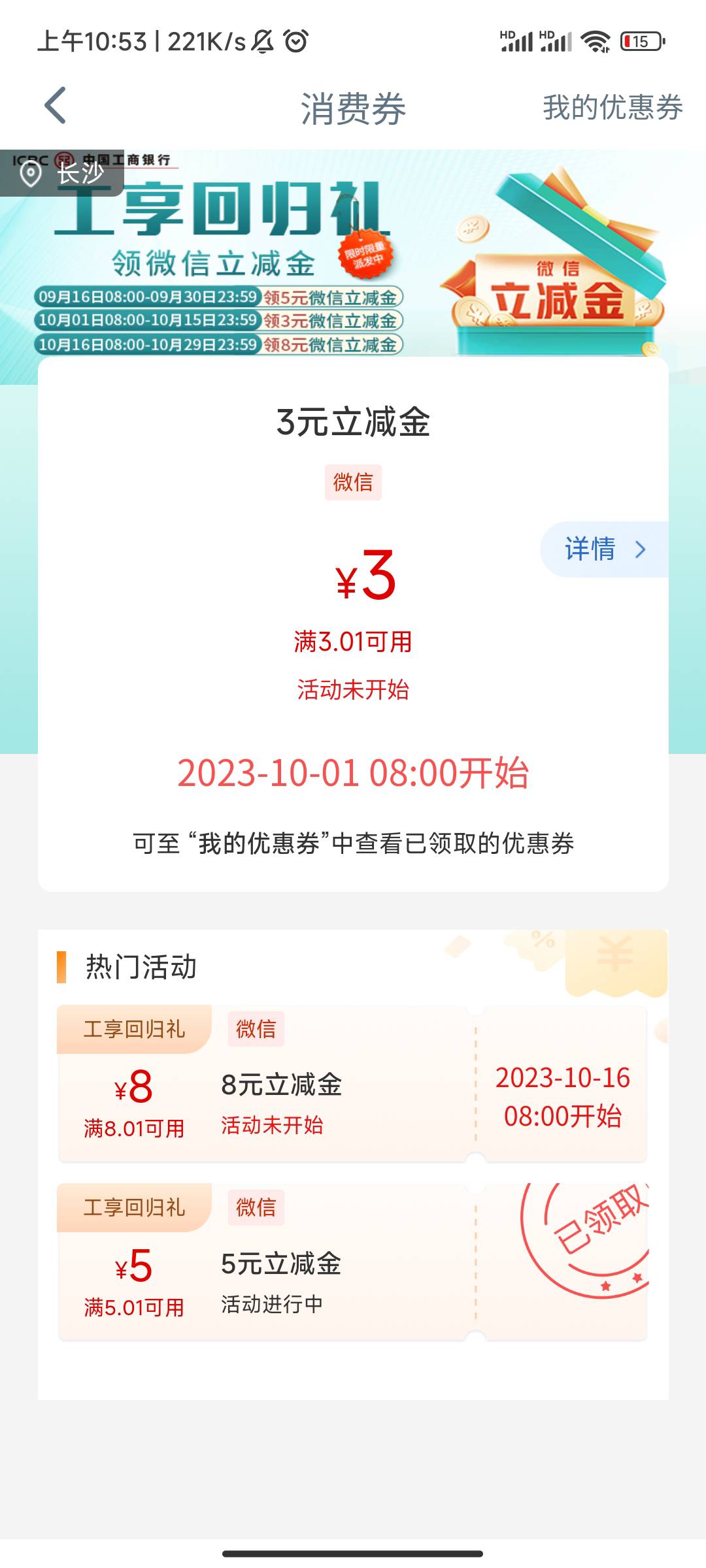 首发,工行定位长沙,消费季,我飞的西安,定位长沙,领了5立减金,不限卡