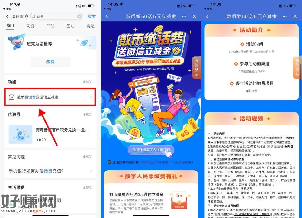 建行APP搜索“话费”->根据规则使用数币钱包支付,充50元话费赠送5元立减金,刚好要冲的可以看看。