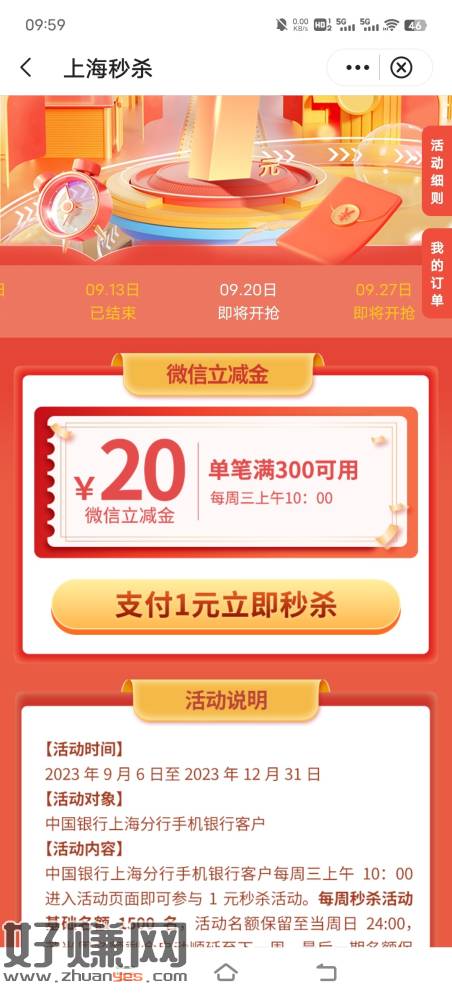 中国银行是上海的 进APP1元秒杀。直接到微信。
