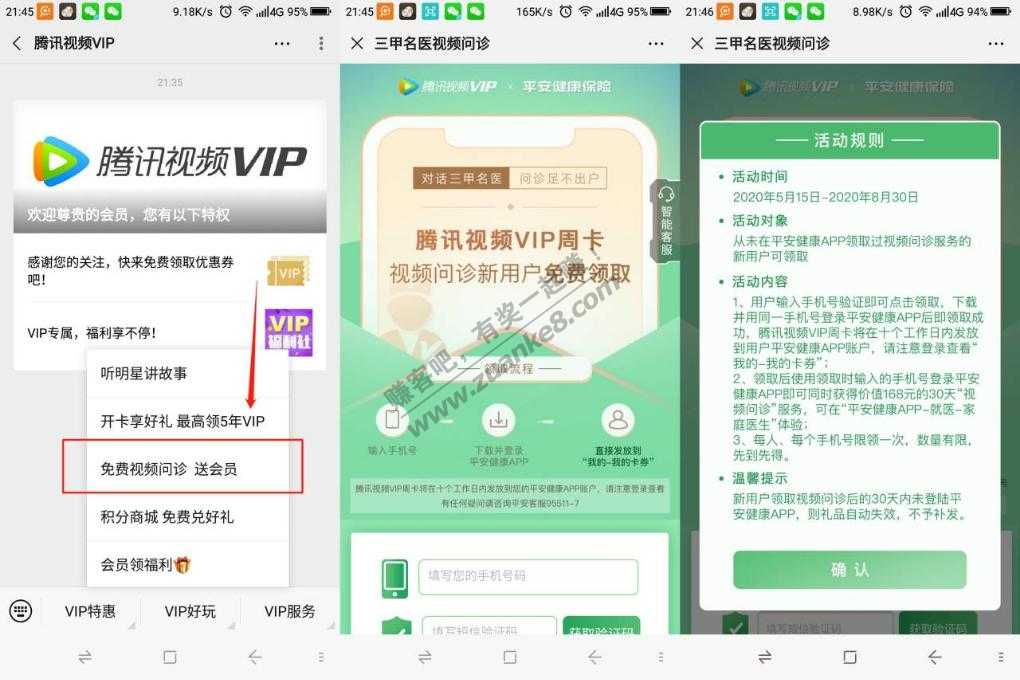 免费领腾讯视频会员1个月->微信关注公众号“腾讯视频VIP”->菜单栏 免费视频问诊->输入手机号领取->下载注册APP即可!10个工作日内到我的卡券里!活动截止到8月30日!