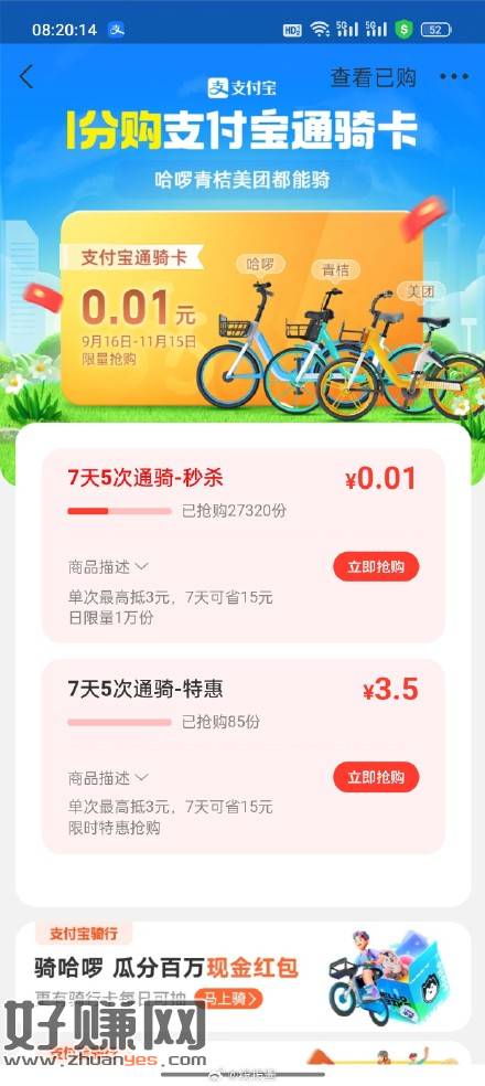 支付宝搜[ 一分钱骑通 ]可0.01买七天5次卡,可骑