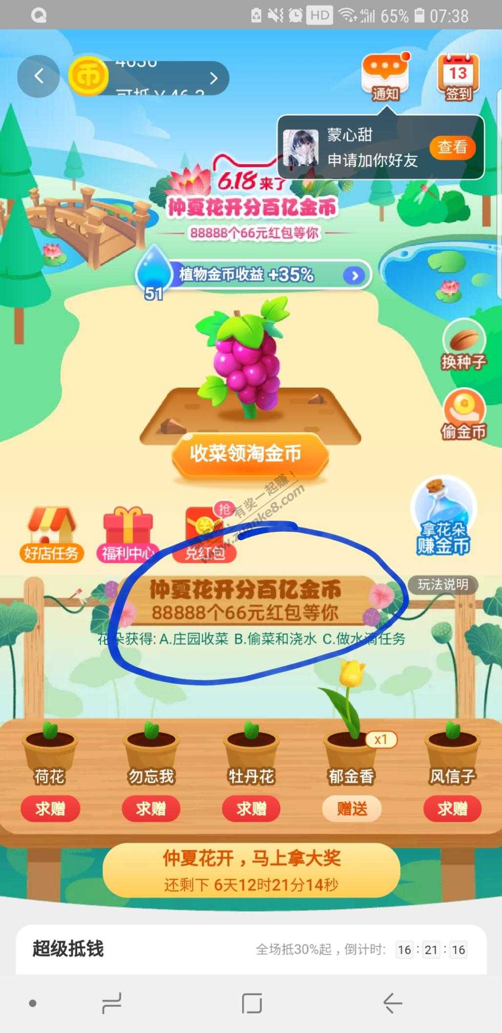 活动玩法:每天收菜,偷菜,浇水,做水滴任务,集齐五朵花即可有机会获得66元红包,老活动了,之前我几个号都中了66元,没什么必中法则,越早集齐,中奖率越大