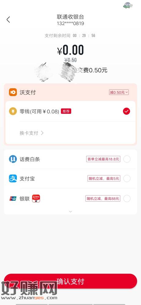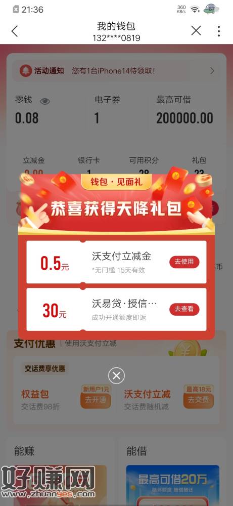 联通APP我的钱包,弹窗领取0.5元无门槛话费卷