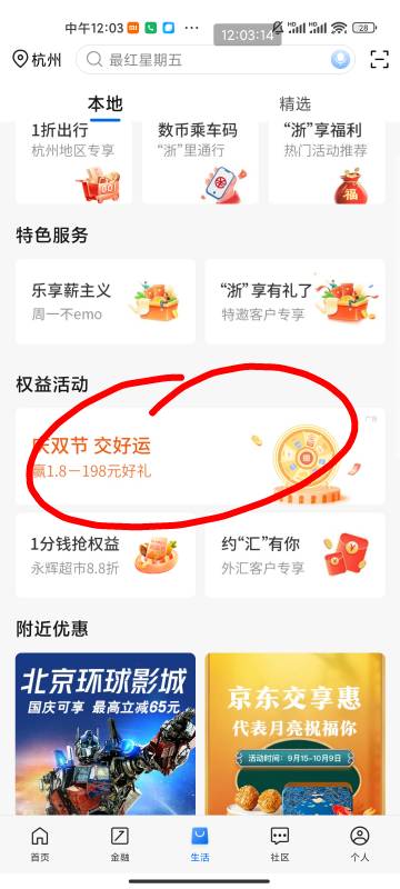 浙江娇娇有卡的生活页面改杭州庆双节 交好运抽奖