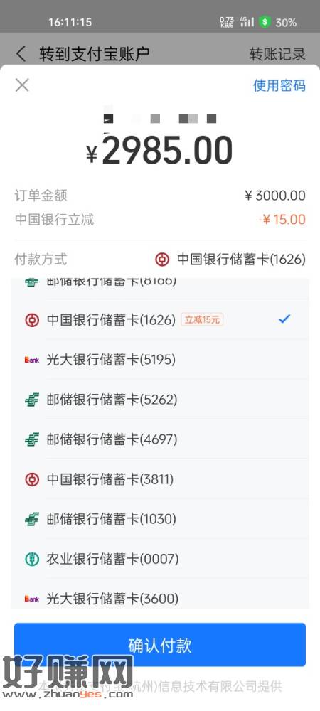 支付宝中行行转账3000-15天津卡出优惠