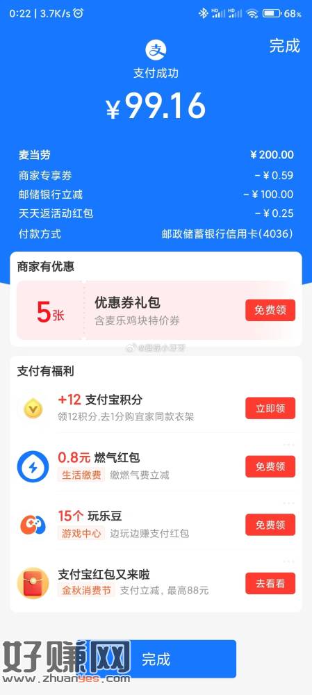 反馈 有卡自测 邮储xyk zfb 搜“麦当劳”充礼品卡200-100