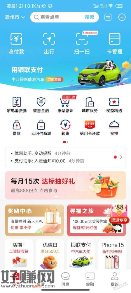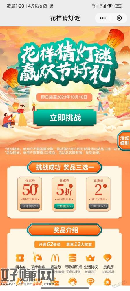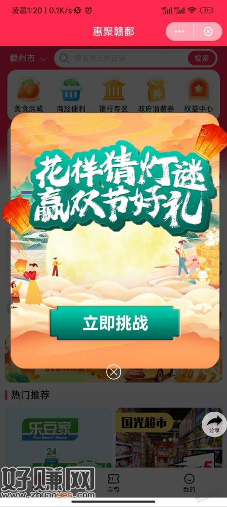 定位江西,云闪付首页–惠聚赣鄱–花样猜灯谜赢双节好礼–答完题领取五折资格