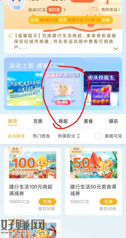 友情提示 建行cc豆过期时间是最后一天22点 不是24点 不想换想攒着的可以通过开盲盒(小赚或者小亏一点) 刷新过期时间