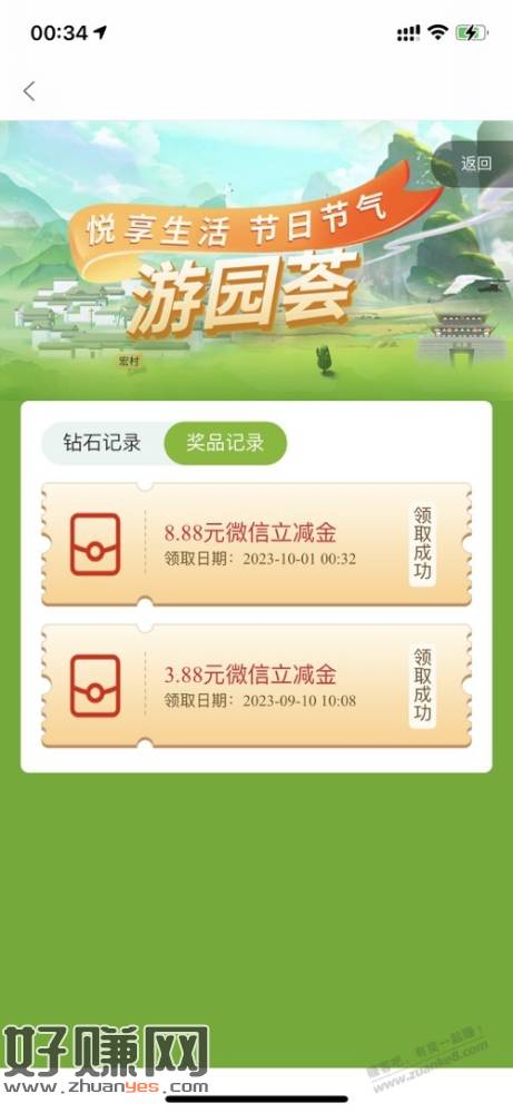 任务中心,游园荟,国庆格子上有个礼盒,点一下显示钻石不够,别管它,手速拉满一直点,有bug可以抽到8.88