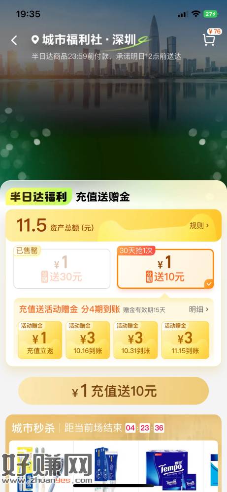 猫超右上角把地址改成深圳 深圳福利社那边1充10 然后还能开