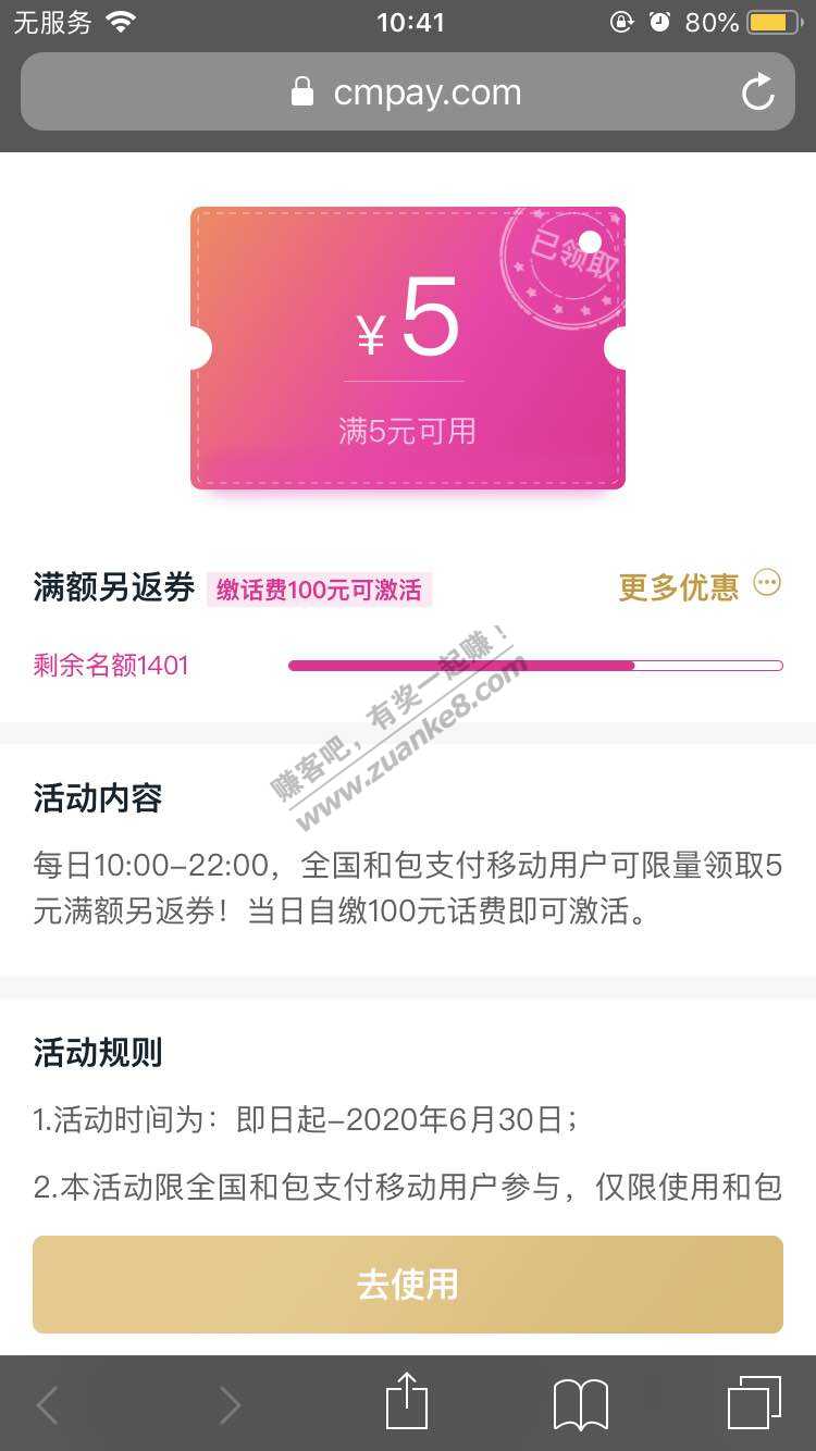 自动领取5元卷,缴费100激活