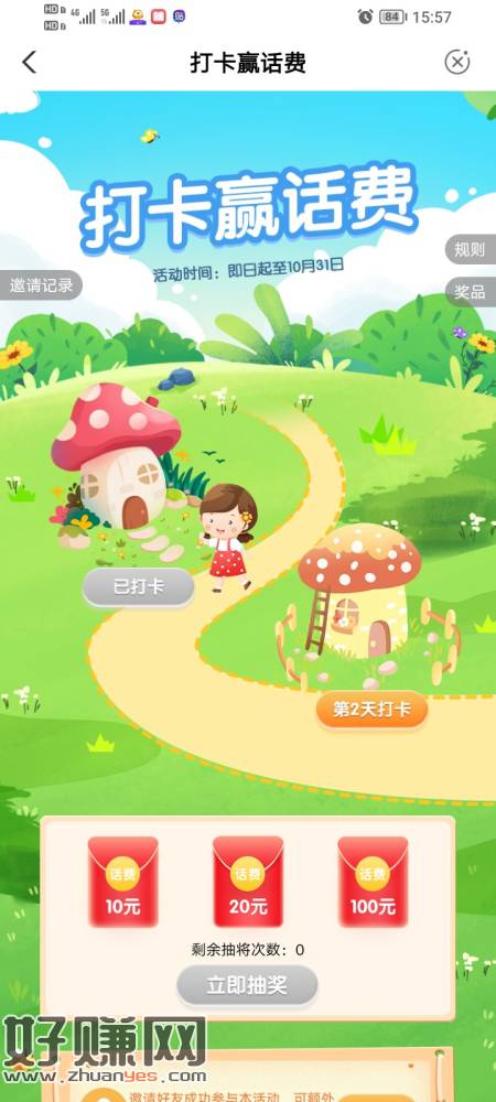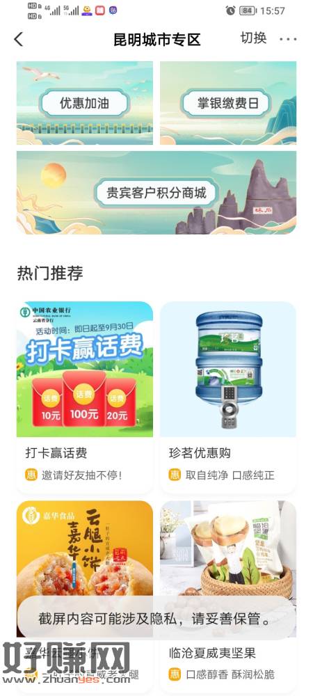 农行云南,城市专区昆明连续打卡2天,抽话费