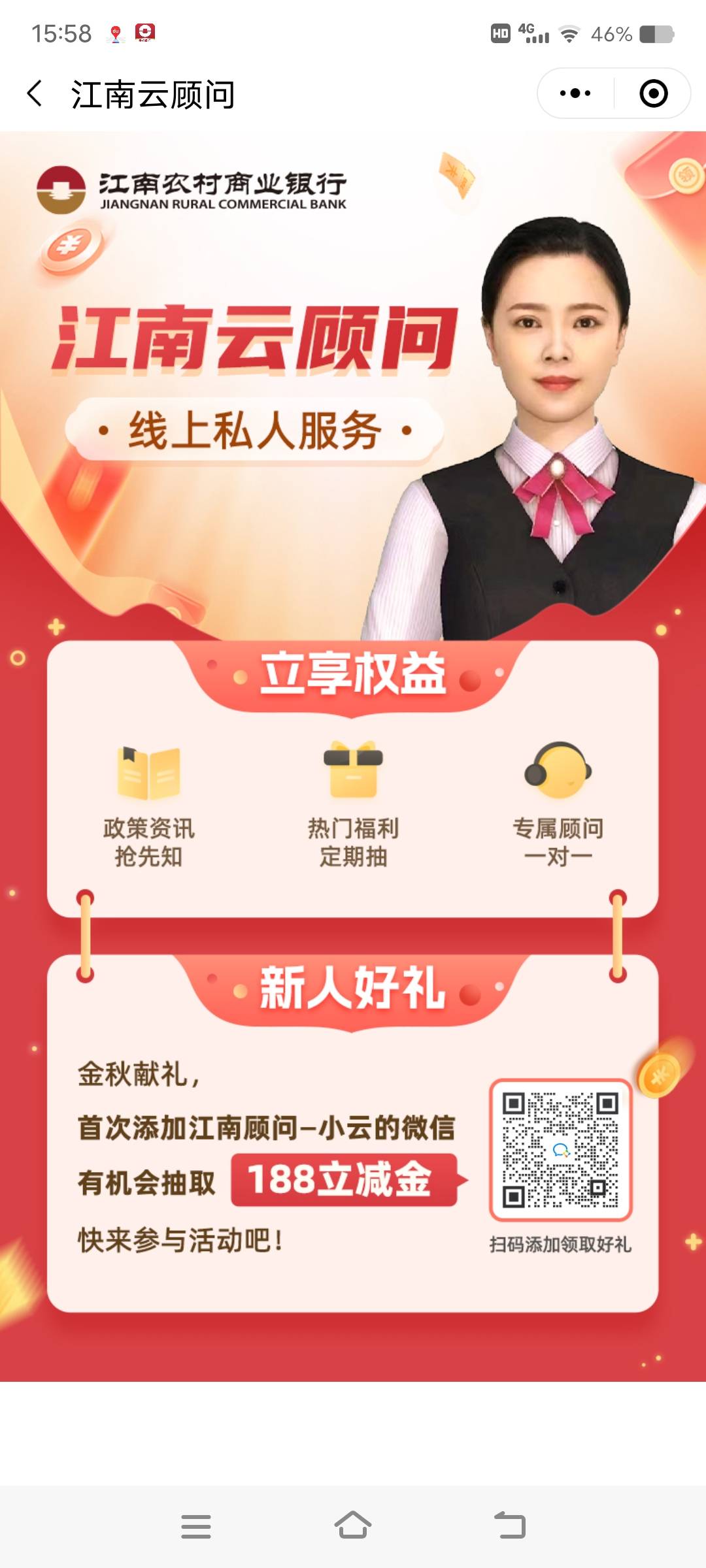 本帖最后由 卡农超管 于 2023-10-2 16:34 编辑 江南农村商业银行添加企微抽奖,限领一张,不能多号