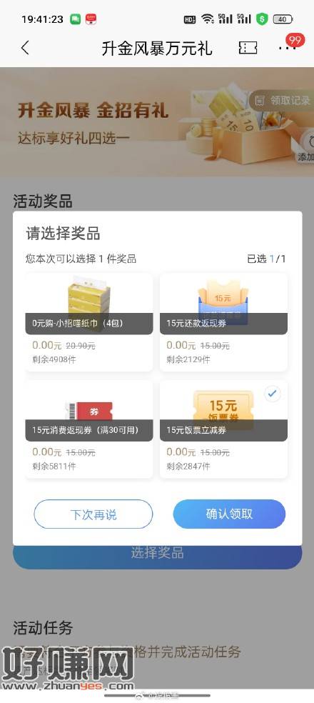 招行15元:,招商银行APP-搜升金风暴-万元户