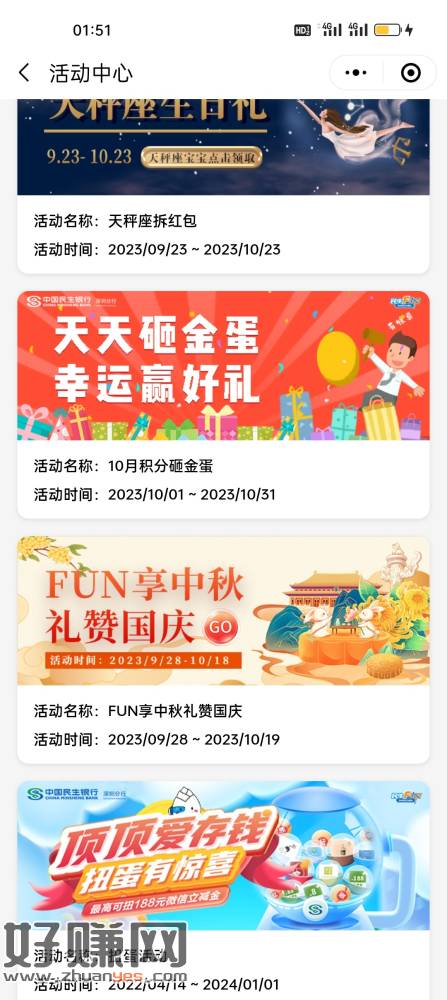 民生FUN小程序首页热门活动更多进去,享中秋礼赞国庆可以抽看看,我中2不是秒到卡包