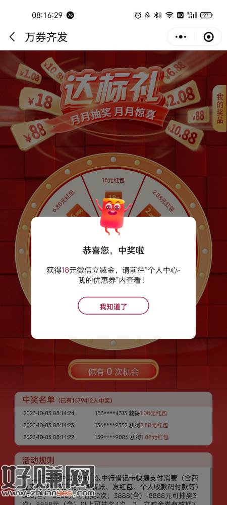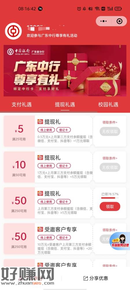 广东中行尊享有礼小程序,上个月完成任务去领取,运气好100+