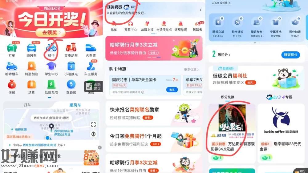 搜哈啰出行看图兑换万达34.9,看不到换号