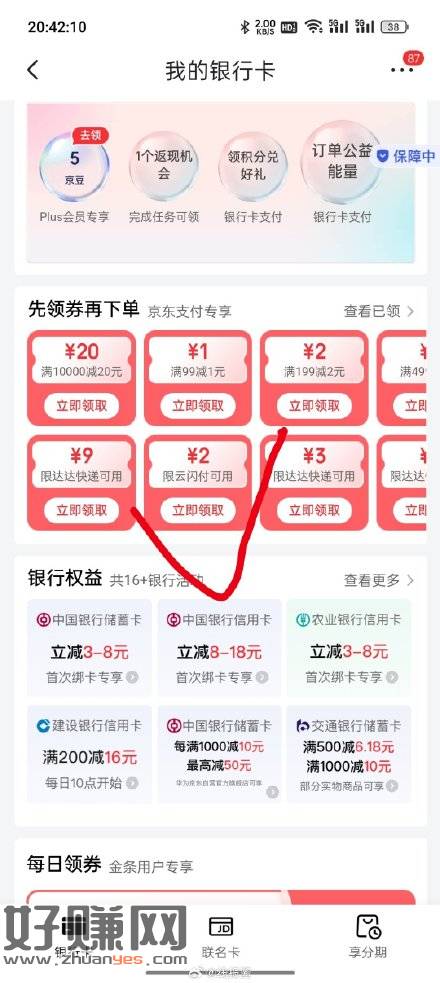 京东APP我的–我的钱包–银行卡,下拉可领取云闪付2元支付券