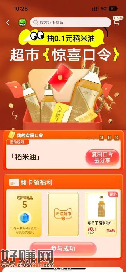 手淘首页进入猫超-右下角-惊喜口令,输入口令词【稻米油】能翻到0.1元实物,大概率不包邮