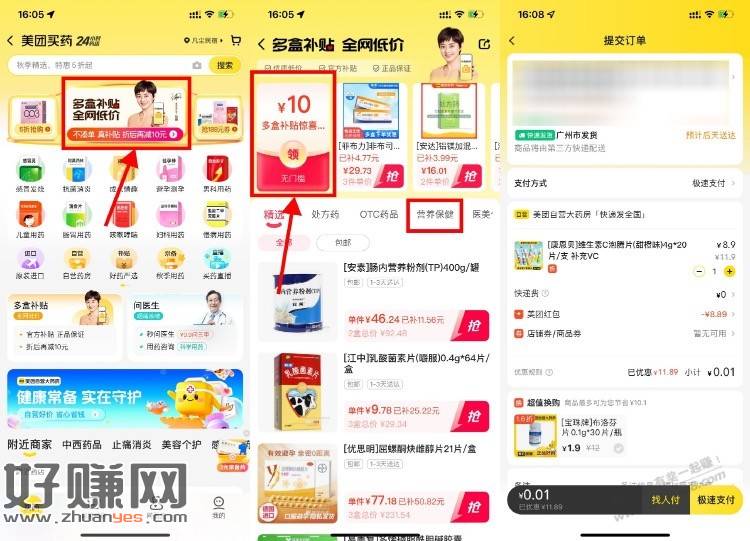 美团APP首页“买药”->多盒补贴->领10元无门槛券,可以0.01元买康恩贝VC泡腾片