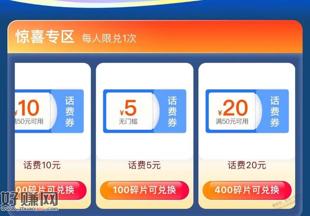 400碎片可兑换话费奍50-20