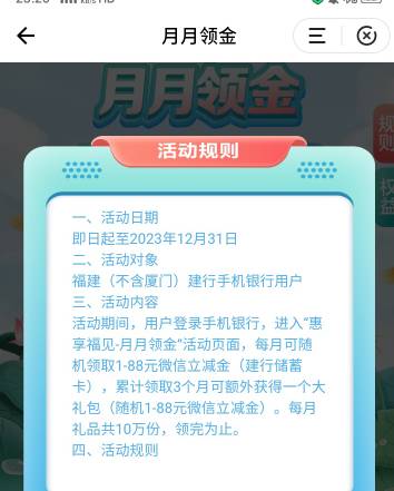 福建(不含厦门)建行手机银行用户,惠享福见,月月领金。