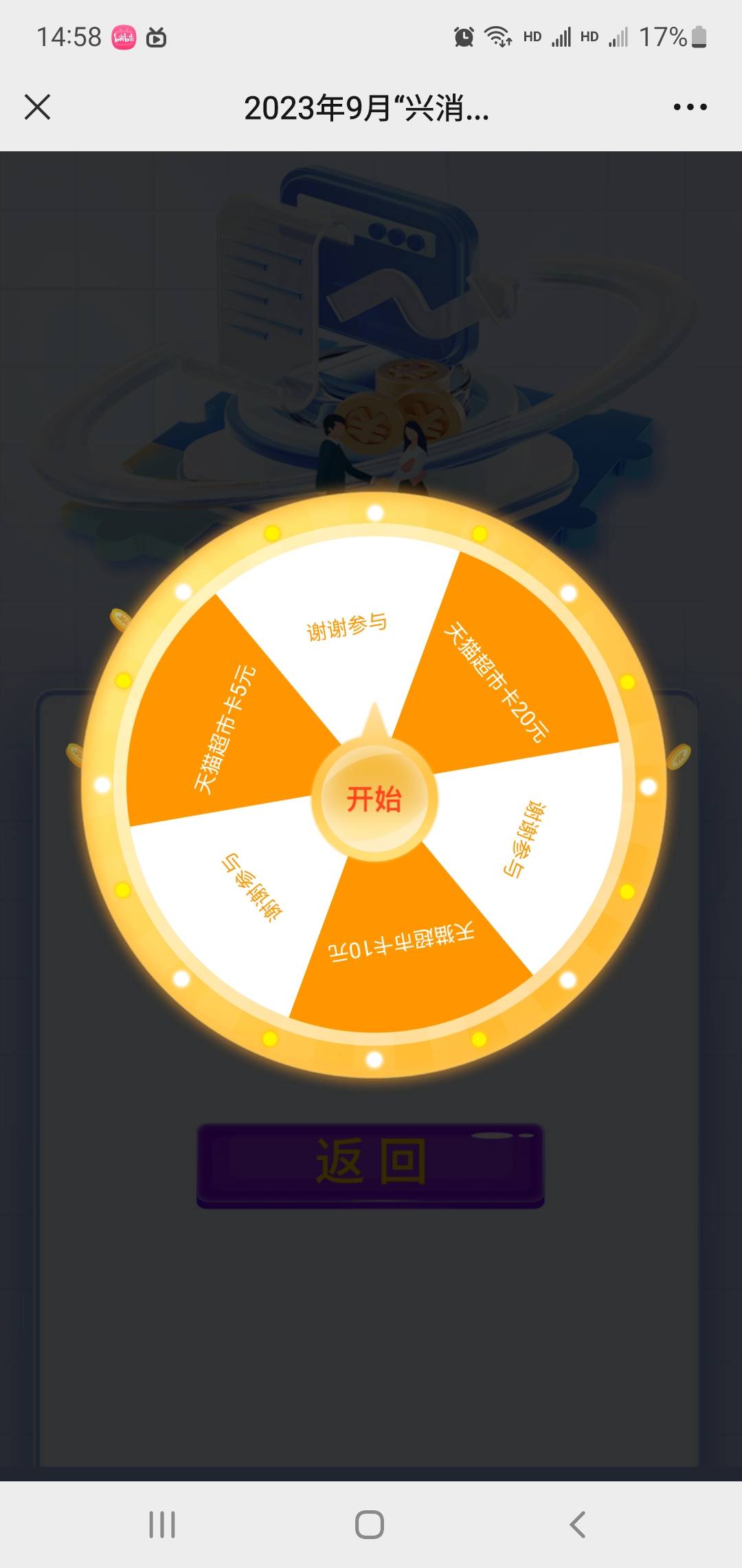 本帖最后由 卡农超管 于 2023-10-6 21:30 编辑 兴业“兴消保”有奖问答活动抽奖,官方码无头。