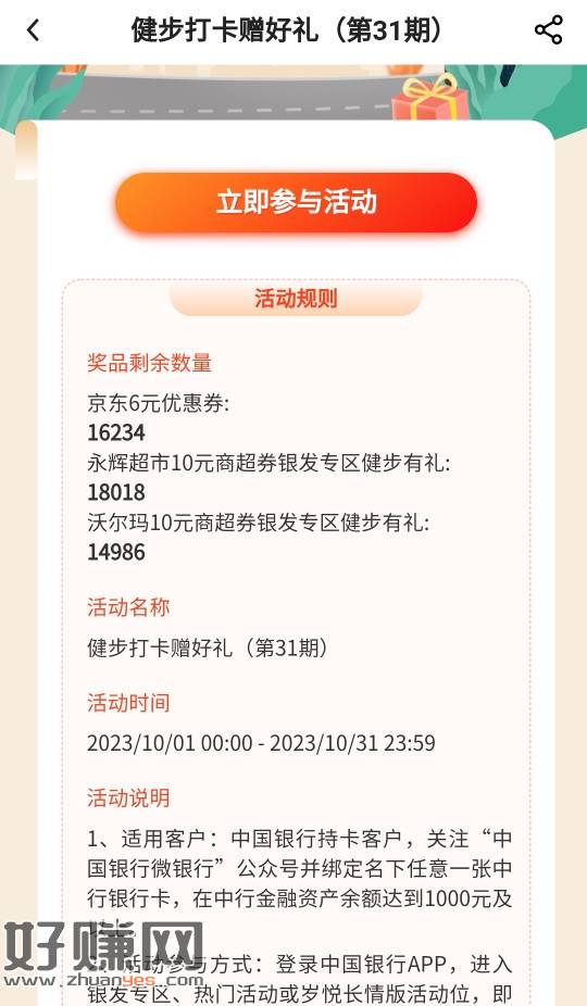 资产满1000元的客户(余额放1000),连续打卡3天,可得6元京东支付券或10元沃尔玛/永辉券。