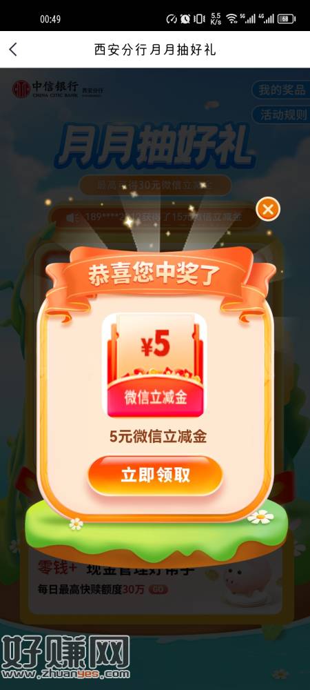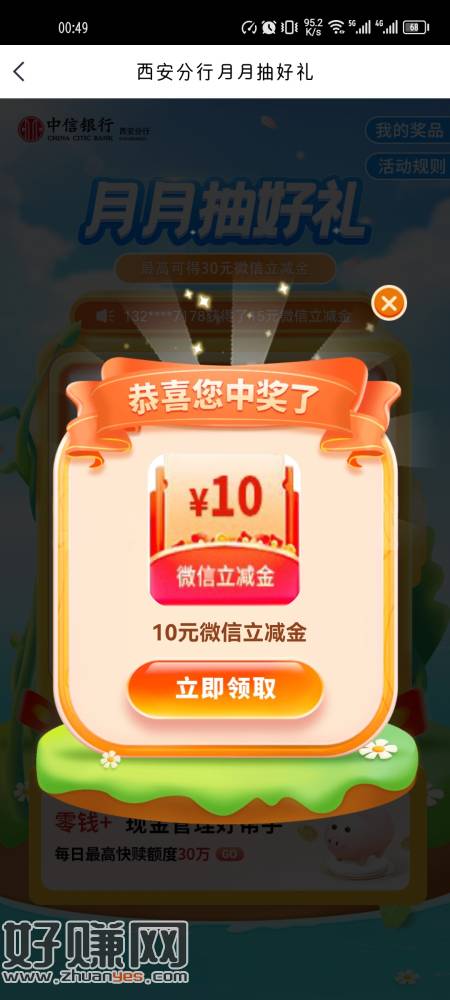 开过中信西安户的去抽,每月两次,可抽到年底,抽到的立减金不限