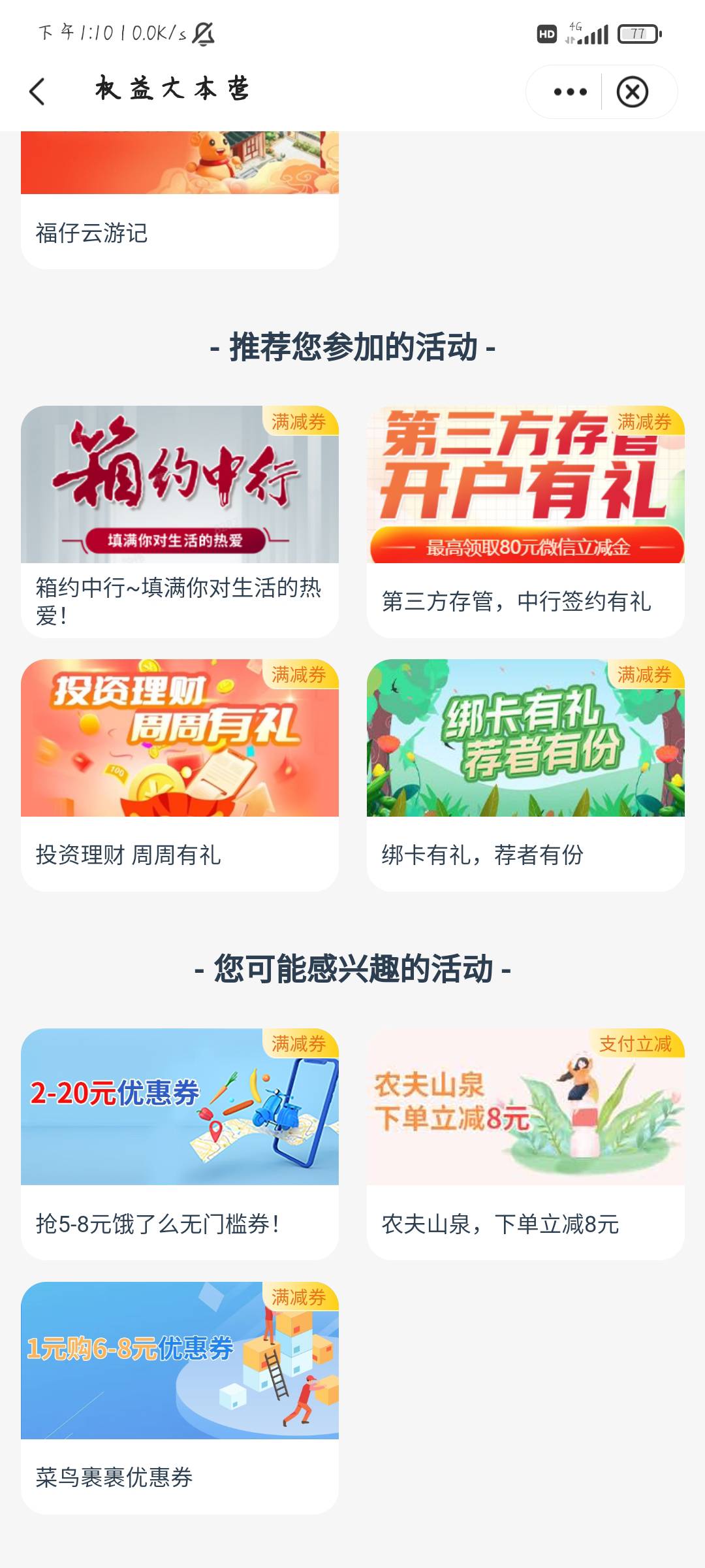 本帖最后由 卡农超管 于 2023-10-7 13:15 编辑 中行徐州权益大本营绑卡有礼荐者有份活动,我进去就有一次抽奖机会,已经领了好几个月了