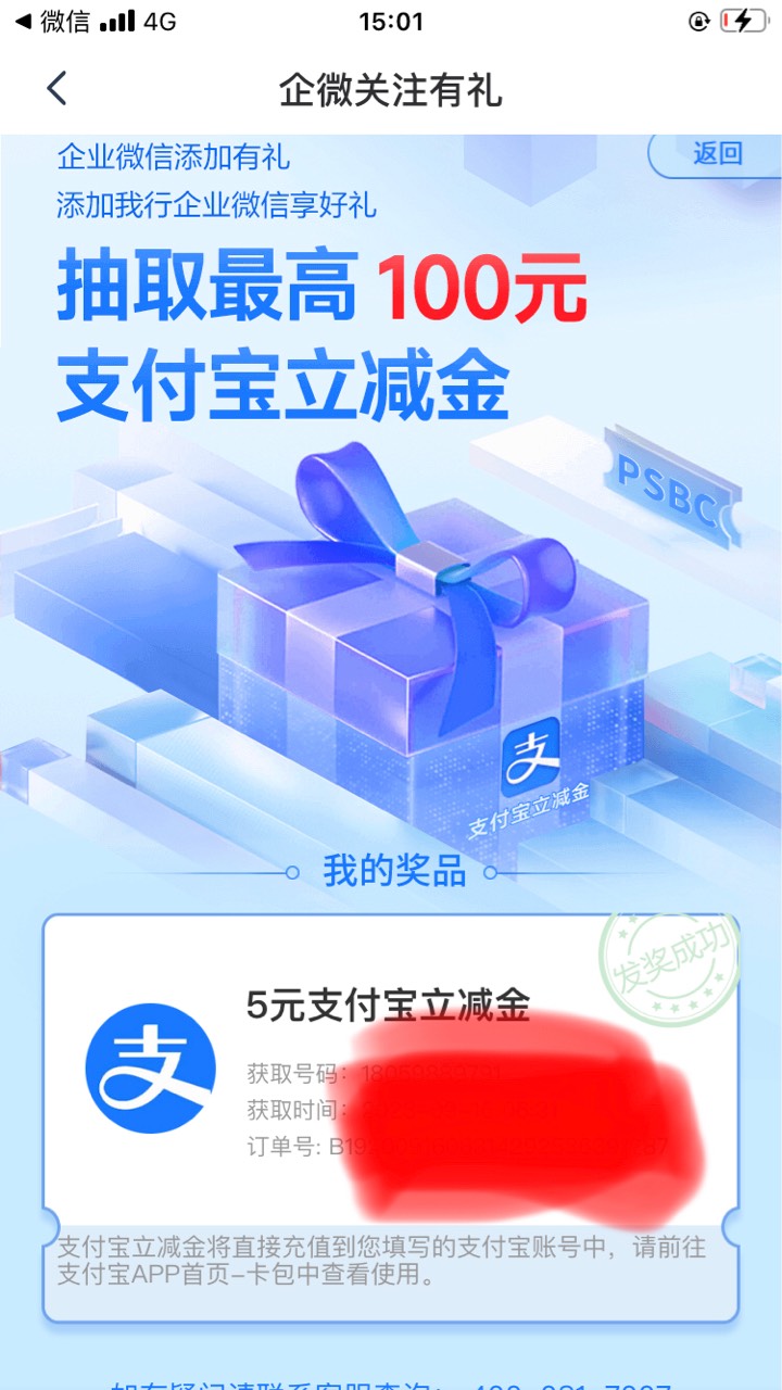 邮储北京企微添加有礼,抽取支付宝立减金,已复活