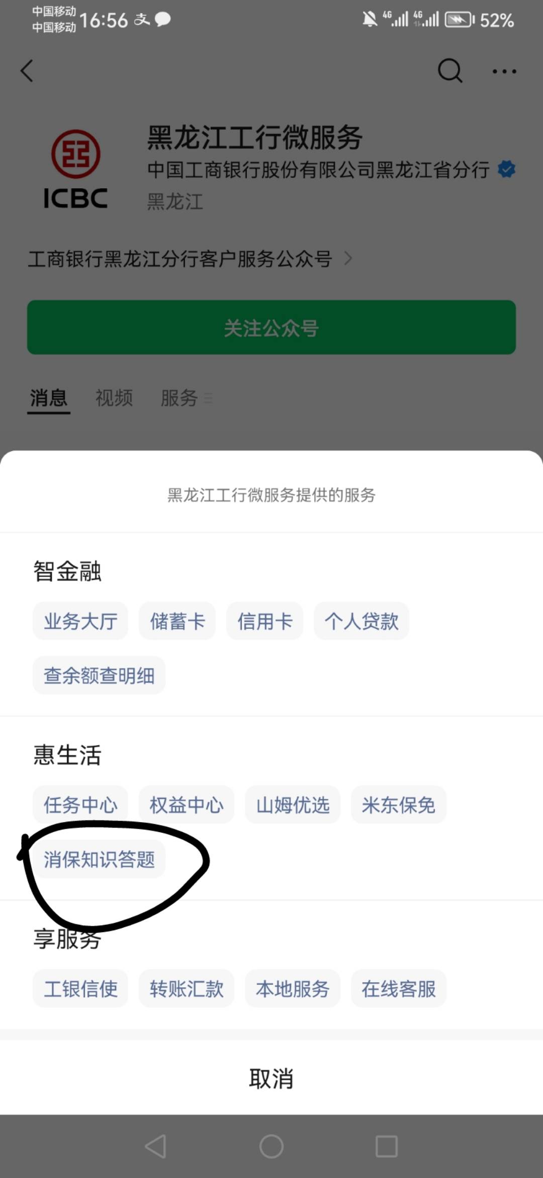 本帖最后由 卡农超管 于 2023-10-7 17:05 编辑 工行黑龙江微服务公众号消保知识答题活动,需黑龙江卡多v多撸,进去把邀请码弄出来用别的微信助力三次就行,微信可以反复助力
