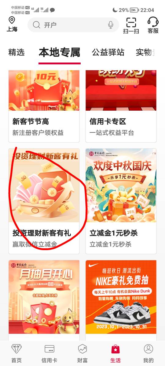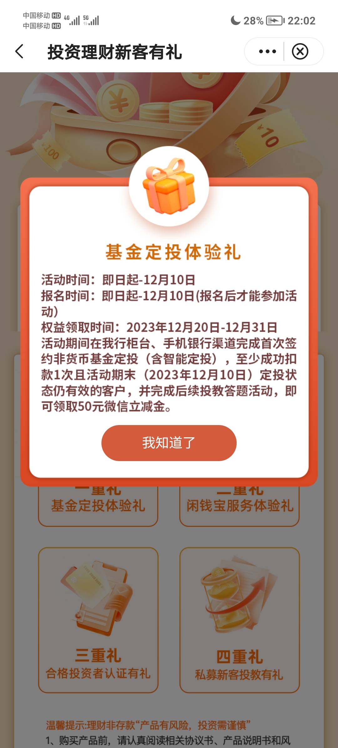 本帖最后由 卡农超管 于 2023-10-7 22:12 编辑 中行上海投资理财新客有礼活动,基金体验1元12月领取50活动规则附上,扣款一次就行未限制金额,保持到12月底就可以领别说记不记得,1毛舍不得还申请啥毛