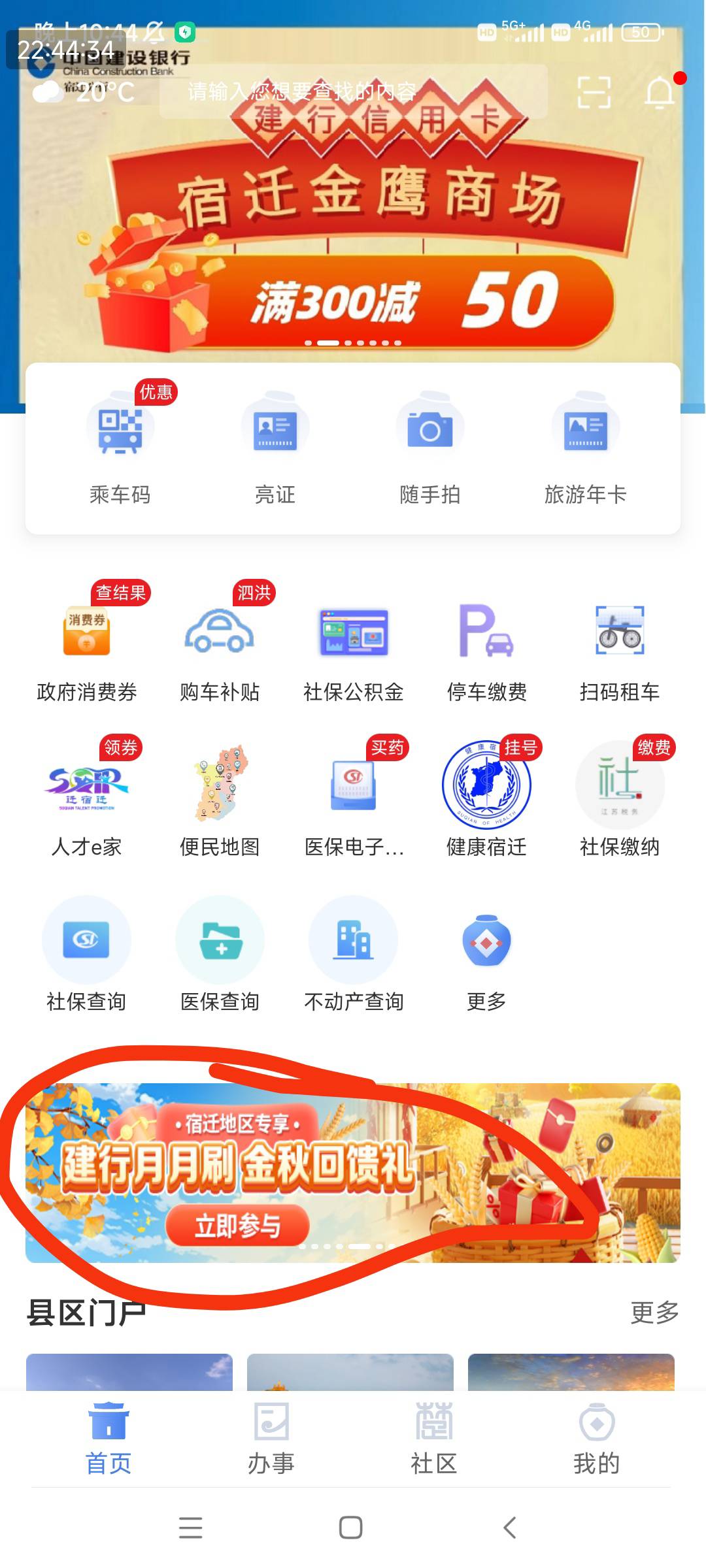 本帖最后由 卡农超管 于 2023-10-7 22:49 编辑 宿心办app横幅建行月月刷金秋回馈礼,不限卡,一共18立减,报名先