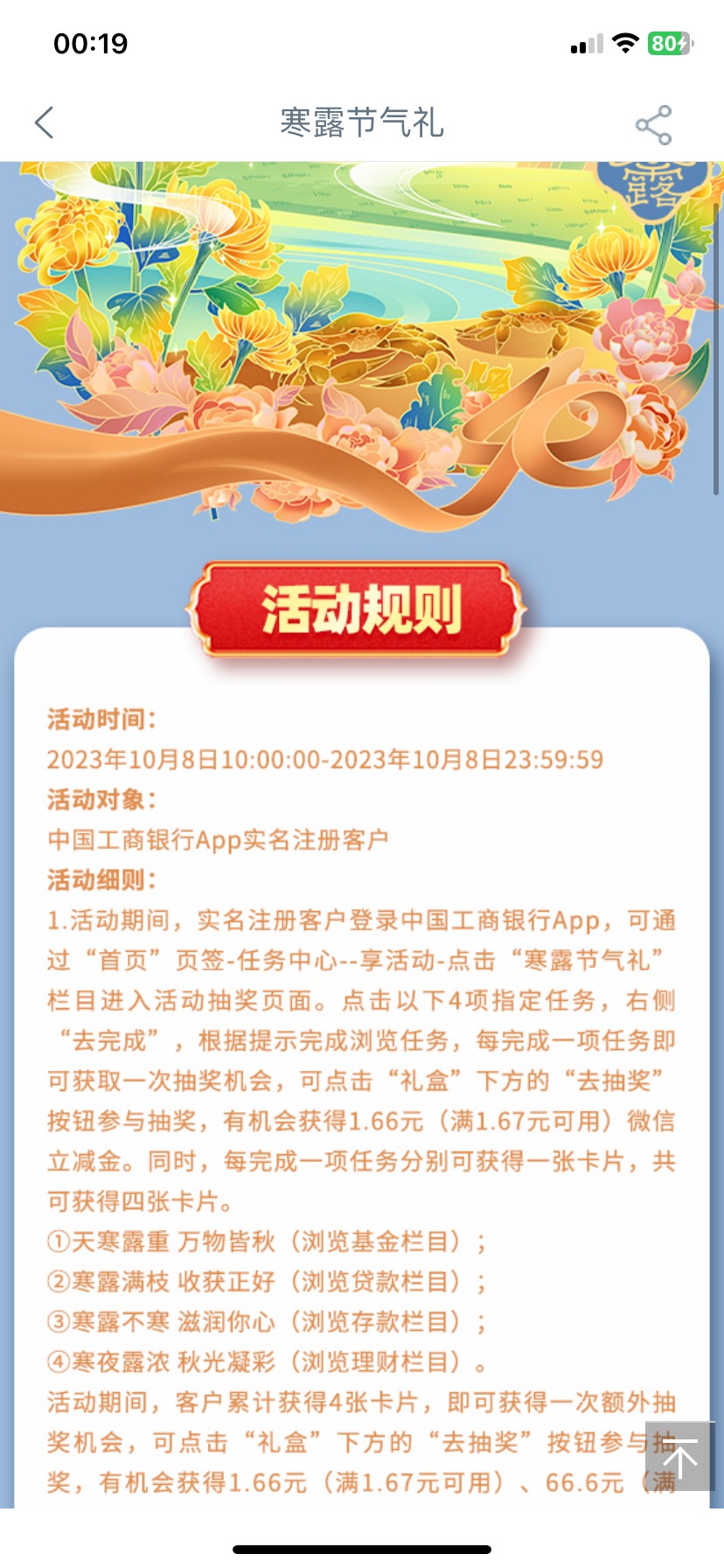 本帖最后由 卡农超管 于 2023-10-8 00:23 编辑 工行任务中心享活动寒露节气礼,活动10点开始