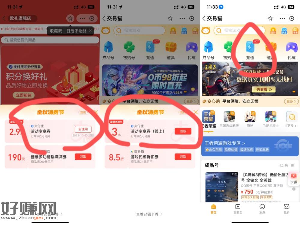 Zfb搜欧礼,交易猫,分开充5个Q币,大概半价