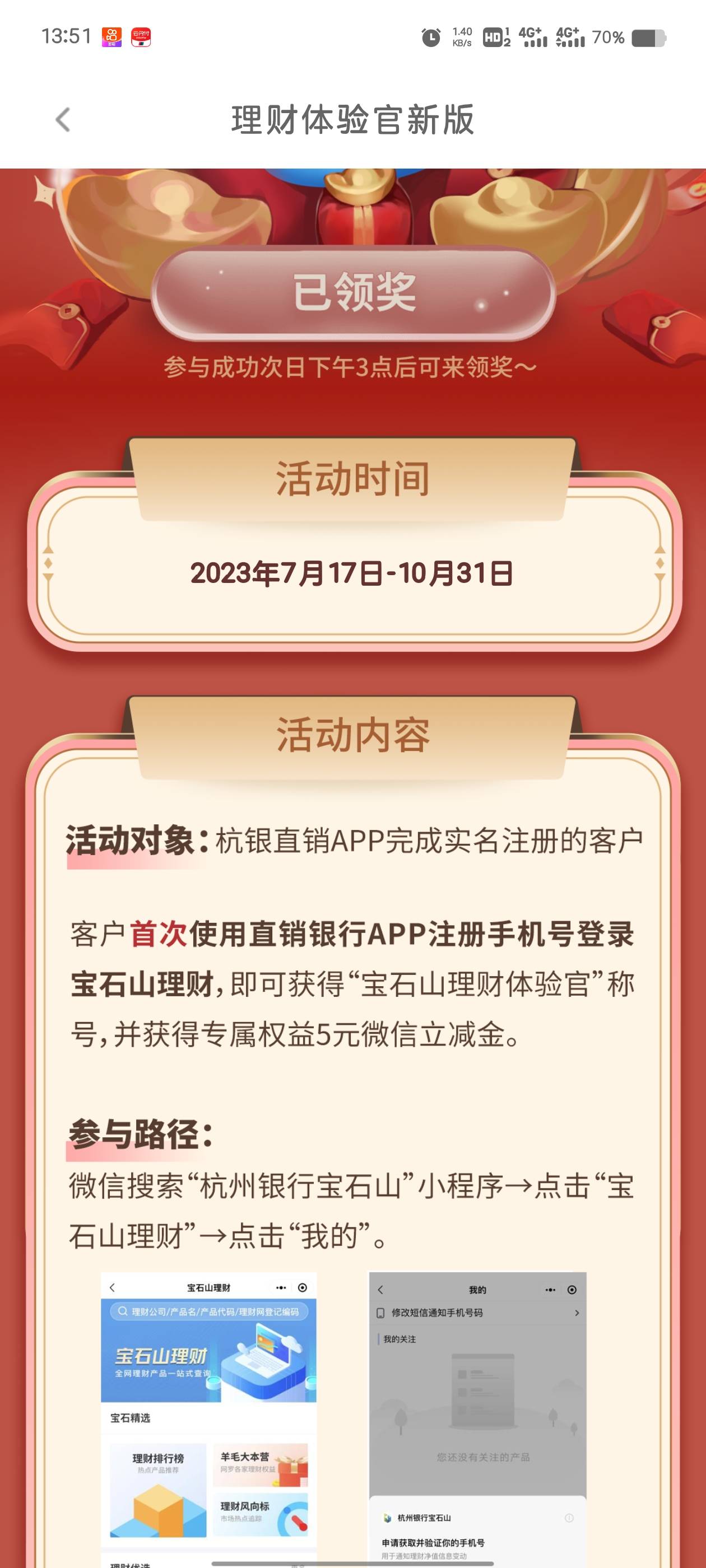 本帖最后由 卡农超管 于 2023-10-8 13:55 编辑 杭州银行宝石山理财体验官活动
