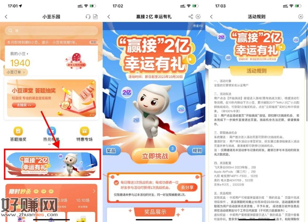 农行APP->我的->小豆乐园->赢接2亿幸运有礼->每天3