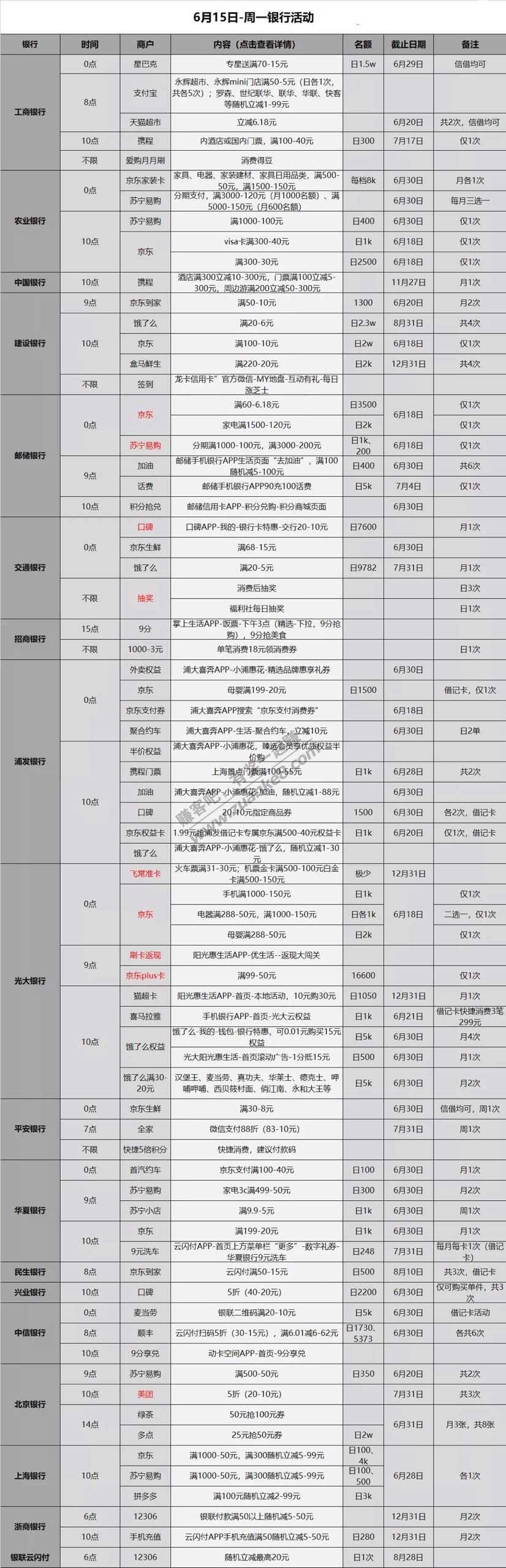 6.15各大银行薅羊毛活动