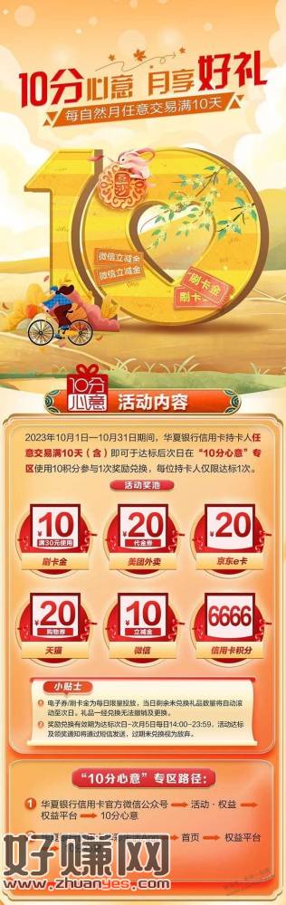 华夏10分心意活动本月又来了!每月使用华夏xing/用卡任意消费满10天可在达标次日每日14点起华夏xing/用卡官方微信或华彩生活APP-权益平台-10分心意兑换10元刷卡金,20元美团外卖券、天猫卡、京东e卡或6666积分(10月31日截止)