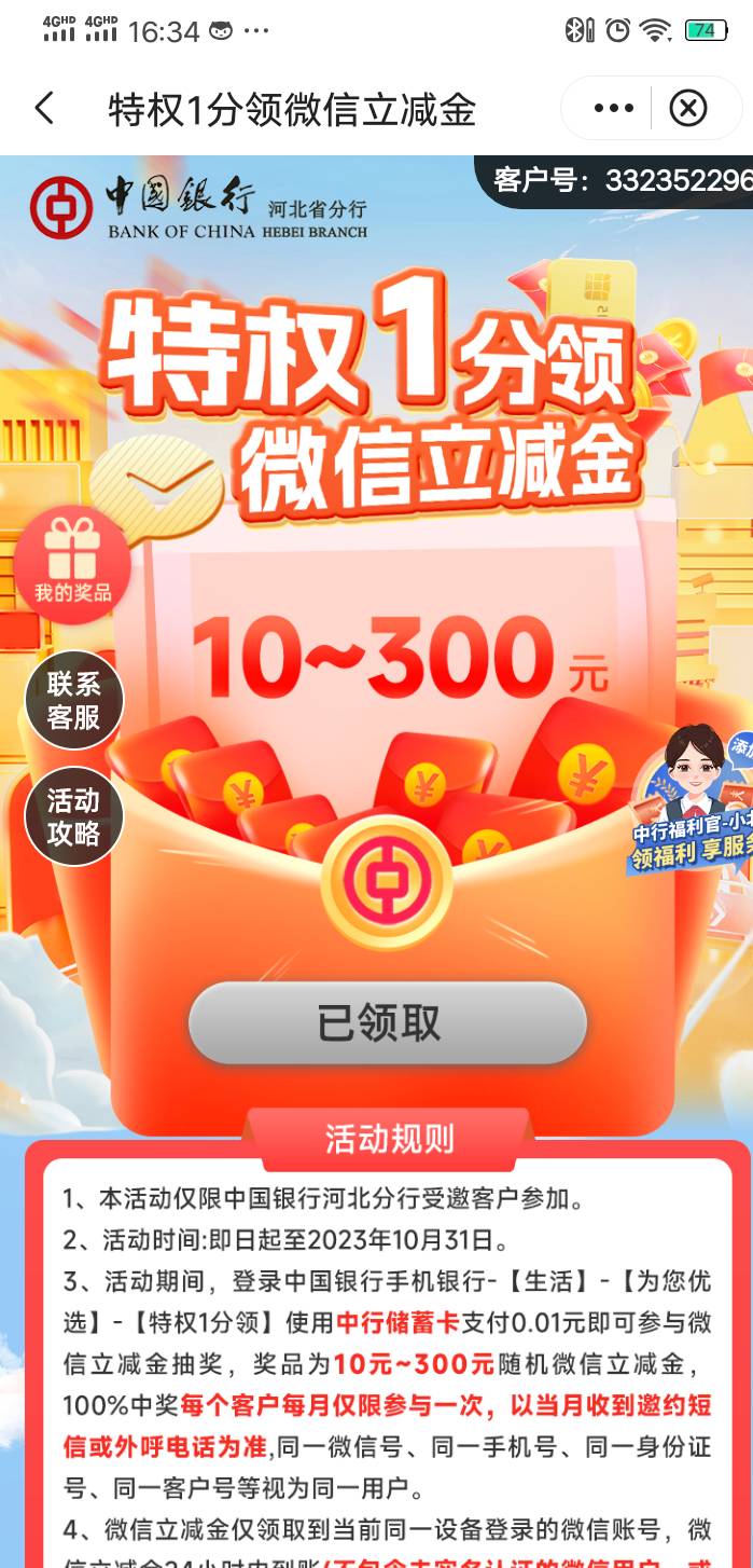 本帖最后由 卡农超管 于 2023-10-9 16:43 编辑 中行河北特权1分领立减金活动