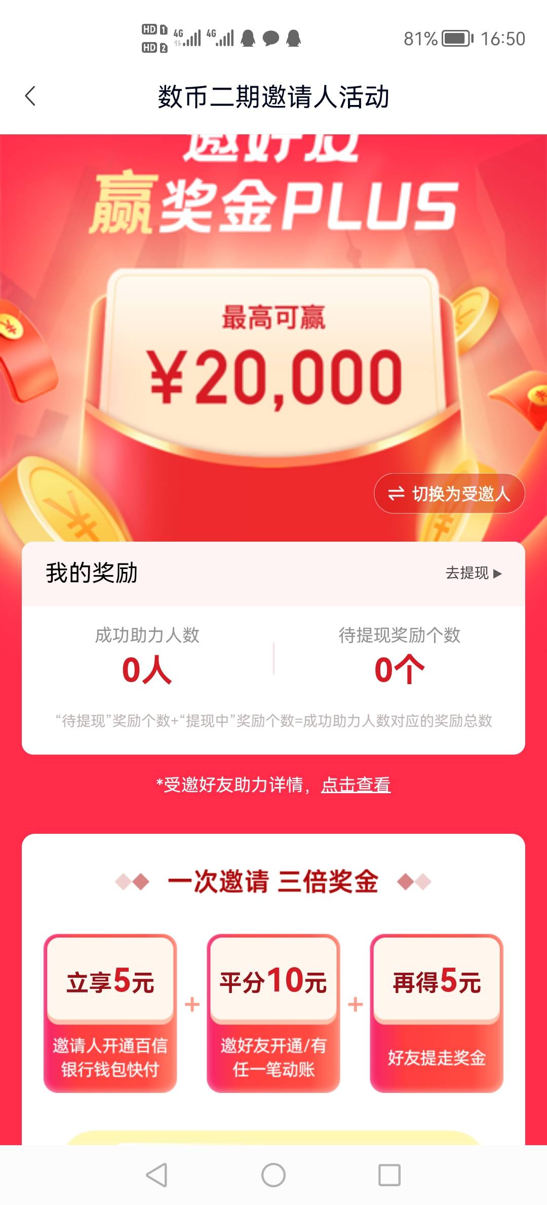 本帖最后由 卡农超管 于 2023-10-9 16:59 编辑 百信银行数币二期邀请人活动,开通钱包快付得5元现金,邀请人和被邀请人都有5元,目前可能系统问题一直火爆,没法报名