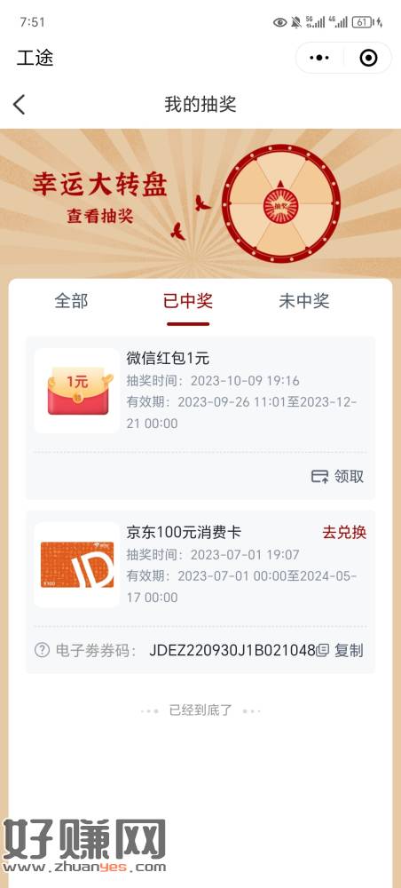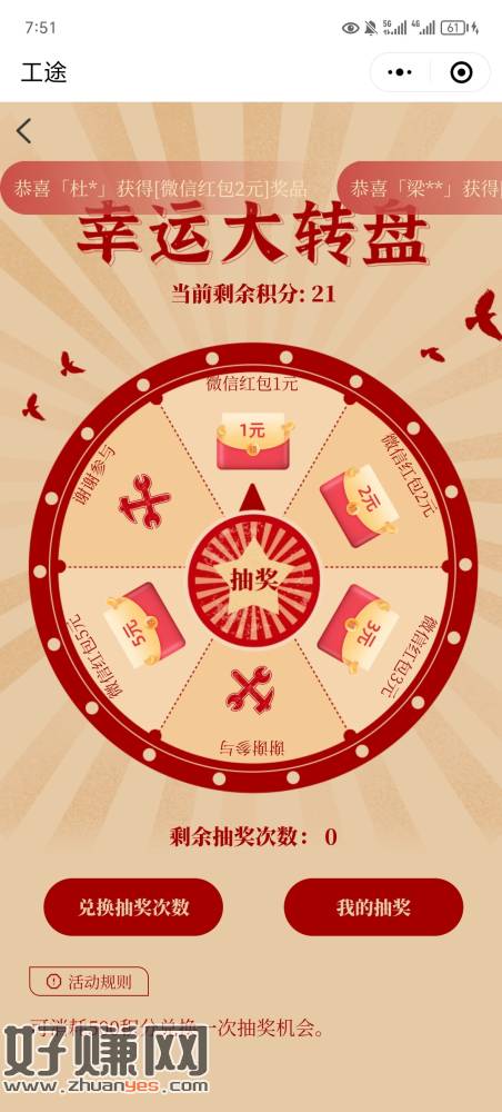 小程序:工途,做任务积分抽奖,1-5r,一个号只能中一次
