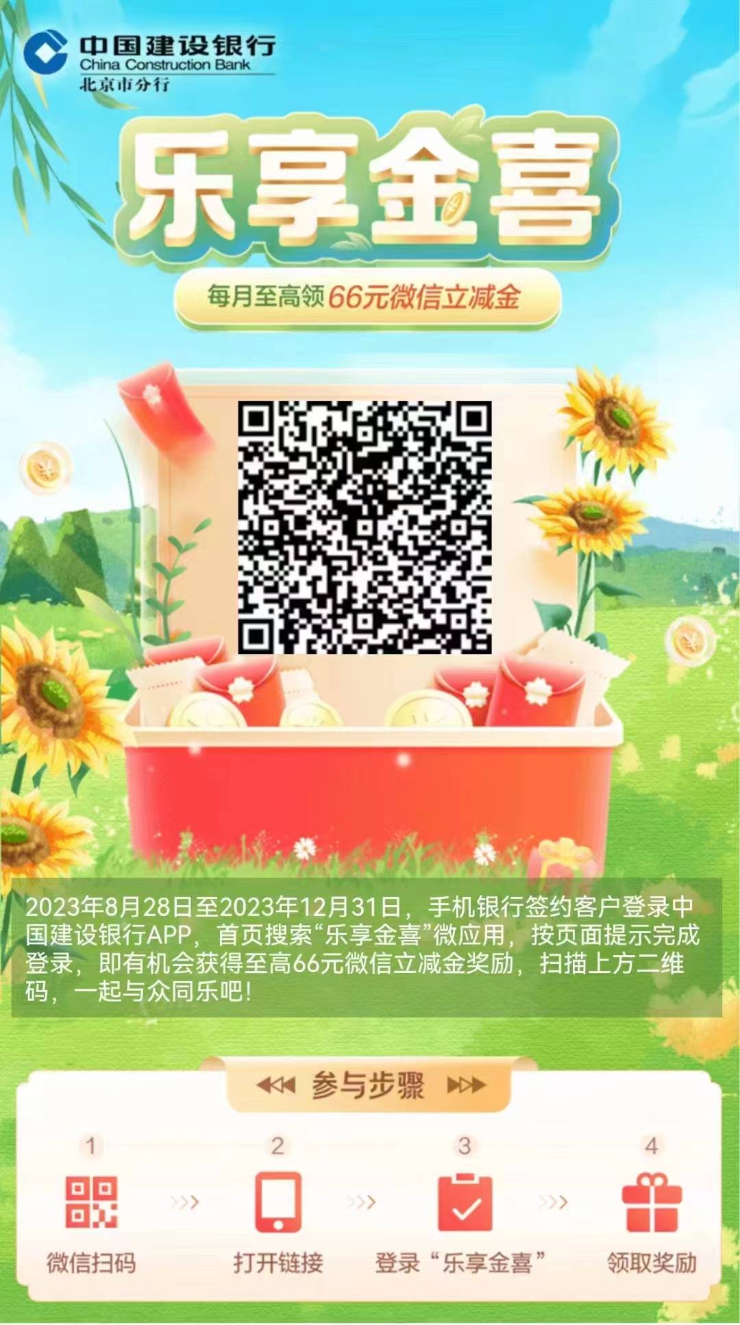 扫图一码支付1分钱,得3-66元微信立减金!北京地区签约建行手机银行的