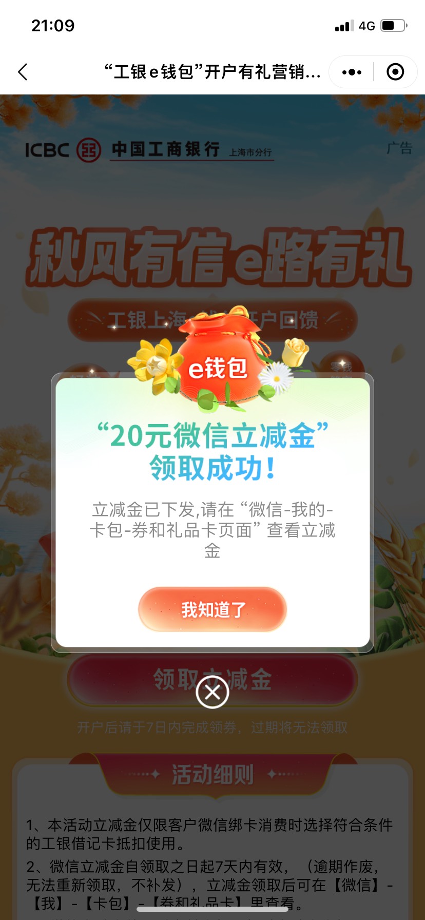 本帖最后由 卡农超管 于 2023-10-9 21:20 编辑 工银上海公众号e钱包新客开户送20立减金