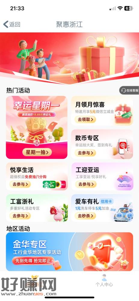 工行首页-聚惠浙江-月领月惊喜领5 必中 现在还有几千份 幸运星期一抽18.8 限浙江