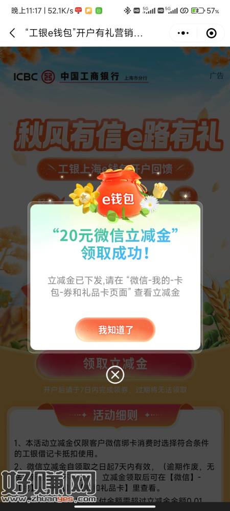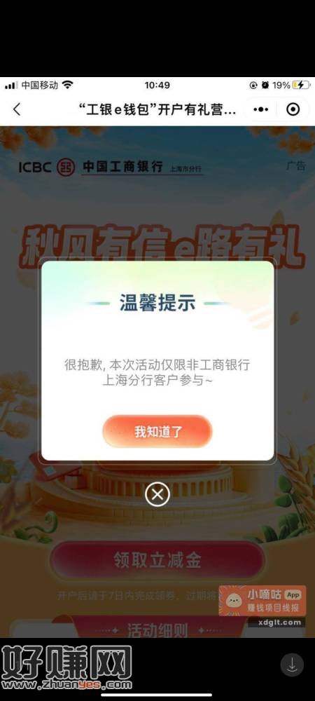 早上工行上海e钱包开了,领不了的,去小程序设置里改一下,我前