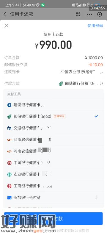 支付宝搜信用卡还款用邮储还1000-10两次,20毛