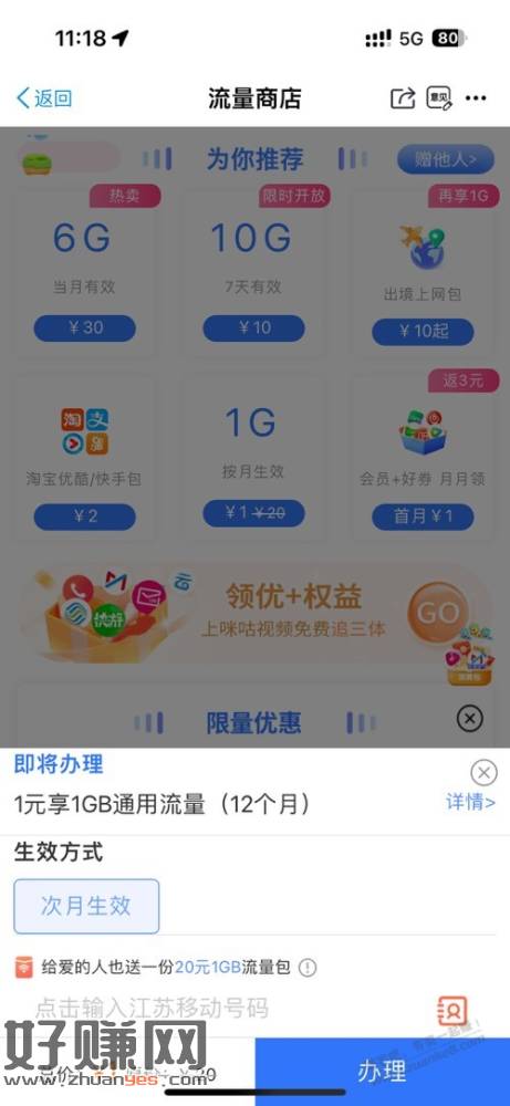 江苏移动微毛 1.1元2G流量 和 存1000送5G流量