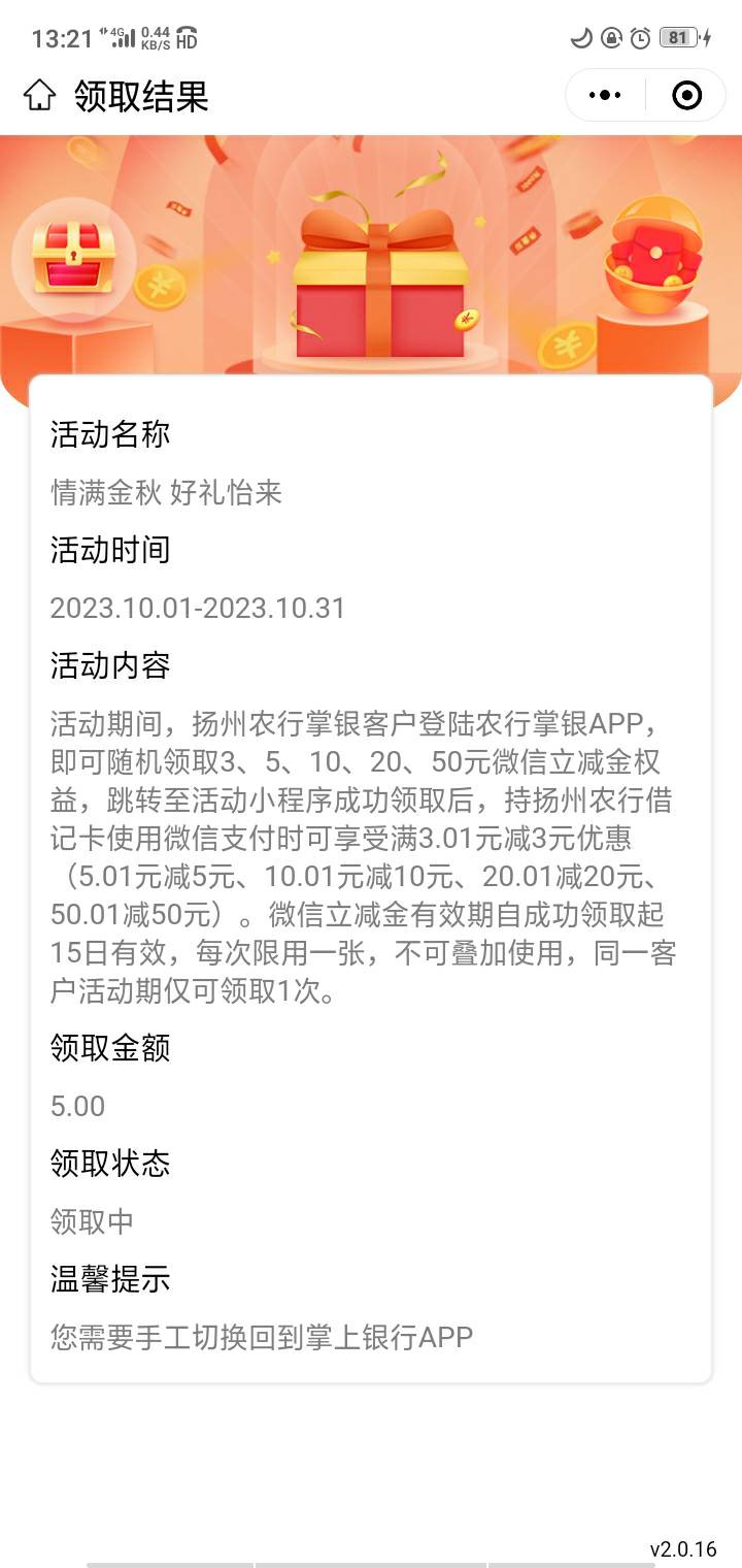 农行江苏扬州101543情满金秋好礼怡来活动,限卡
